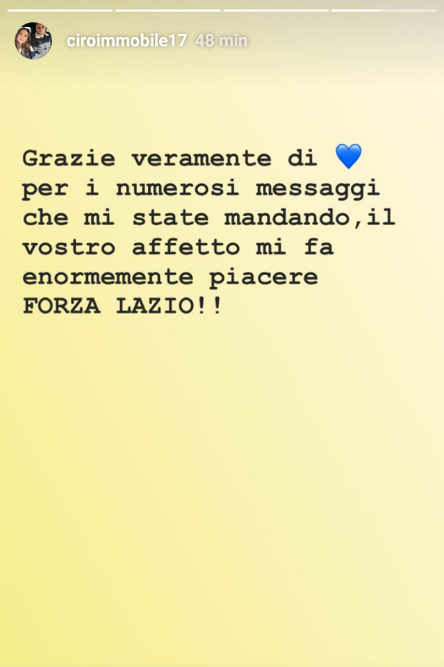 E così, in giornata, il ringraziamento dell’attaccante su Instagram non si è fatto attendere: “Grazie veramente di cuore per i numerosi messaggi che mi state mandando, il vostro affetto mi fa enormemente piacere. Forza Lazio”.