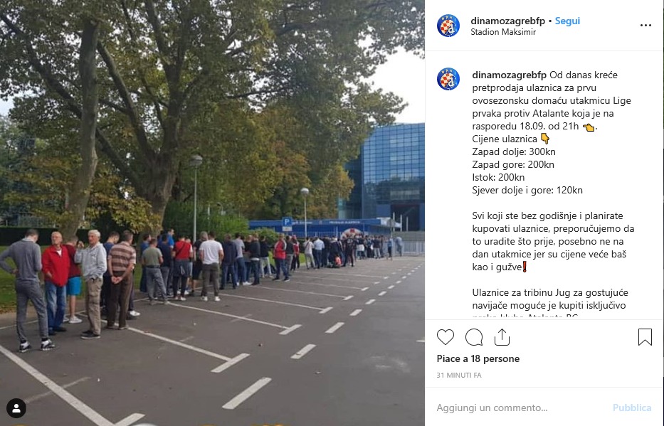 Mancano sei giorni a Dinamo Zagabria-Atalanta e, un’ora dopo l’apertura dei botteghini, c’è già un settore dello Stadion Maksimir completamente esaurito. Si tratta della Tribuna Ovest Inferiore, che come tutte le altre porzioni dell’impianto della capitale croata a eccezione del South Stand – destinato ai tifosi nerazzurri – aveva i biglietti a disposizione da stamattina alle 11 e già prima di mezzogiorno li ha piazzati tutti quanti in prevendita. Sul proprio profilo Instagram il club croato, primo avversario dei bergamaschi nel girone C di Champions League mercoledì 18 settembre alle ore 21, scrive man mano gli aggiornamenti. L’impianto ha una capienza di circa 35 mila posti a sedere.