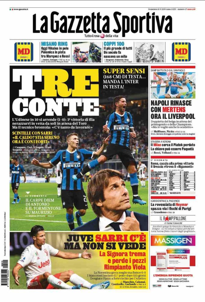 Le prime pagine dei quotidiani sportivi di oggi in edicola, domenica 15 settembre 2019