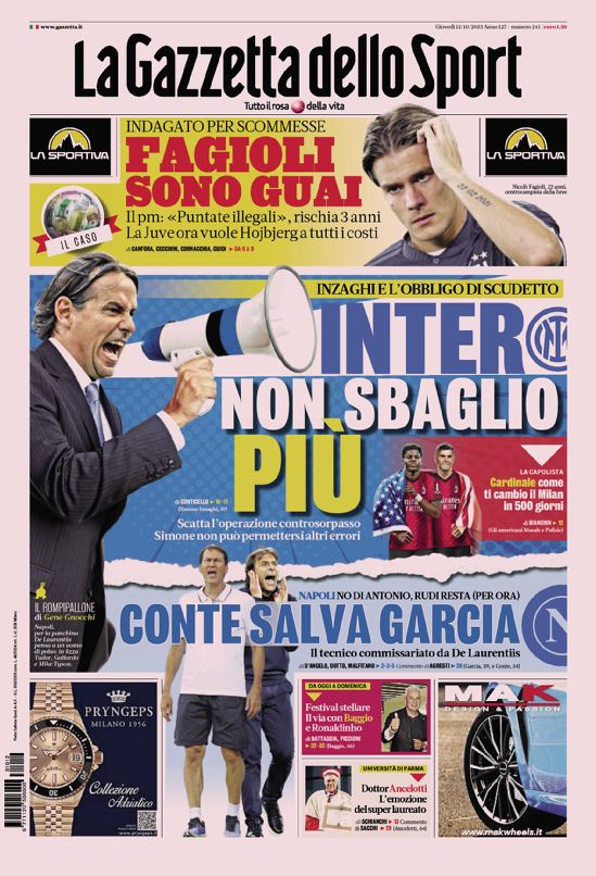 Le prime pagine dei quotidiani sportivi in edicola oggi, giovedƬ 12 ottobre 2023.