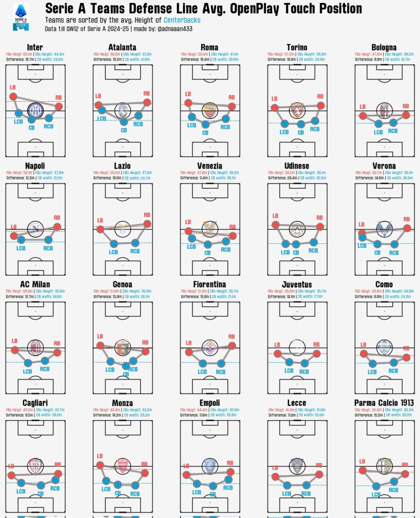Sull’ex Twitter, oggi meglio noto come X (fonte: Mohammad Adnan), compare un interessante dato relativo alle posizioni medie dei difensori, considerando come tali anche gli esterni di fascia che “affiancano” le difese a tre. Particolarmente “aggressivo” risulta essere il posizionamento dei calciatori di Atalanta ed Inter.