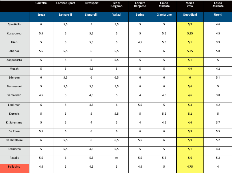 Se per i mass media l’olandese insieme a Charles De Ketelaere è quello che ottenuto più sufficienze, attestandosi su una media di 5,9, per i sostenitori nerazzurri il responso è rispettivamente 5,5 e 5,2. Quello che per i giornalisti chiude il podio, Honest Ahanor, per i tifosi è invece il migliore, si fa per dire, a 5,8, mezzo centesimo di voto in più. Del resto il nigeriano di Cornigliano che si appresta a ritirare il passaporto italiano alla maggiore età, il prossimo 23 febbraio, è stato elogiato anche dall’allenatore Raffaele Palladino a bocce ferme. Bocciato anche il mister, ma questa è un’altra storia.
