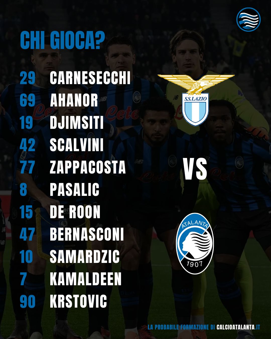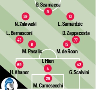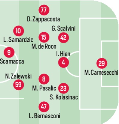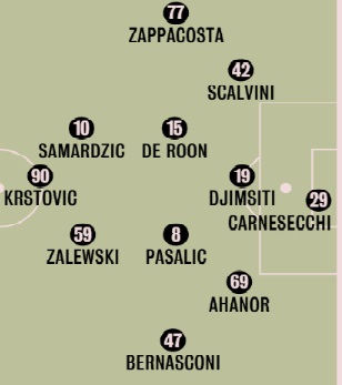 Carnesecchi; Scalvini, Hien, Kolasinac; Bernasconi, de Roon, Pasalic, Zappacosta; Samardzic, Zalewski, Krstovic