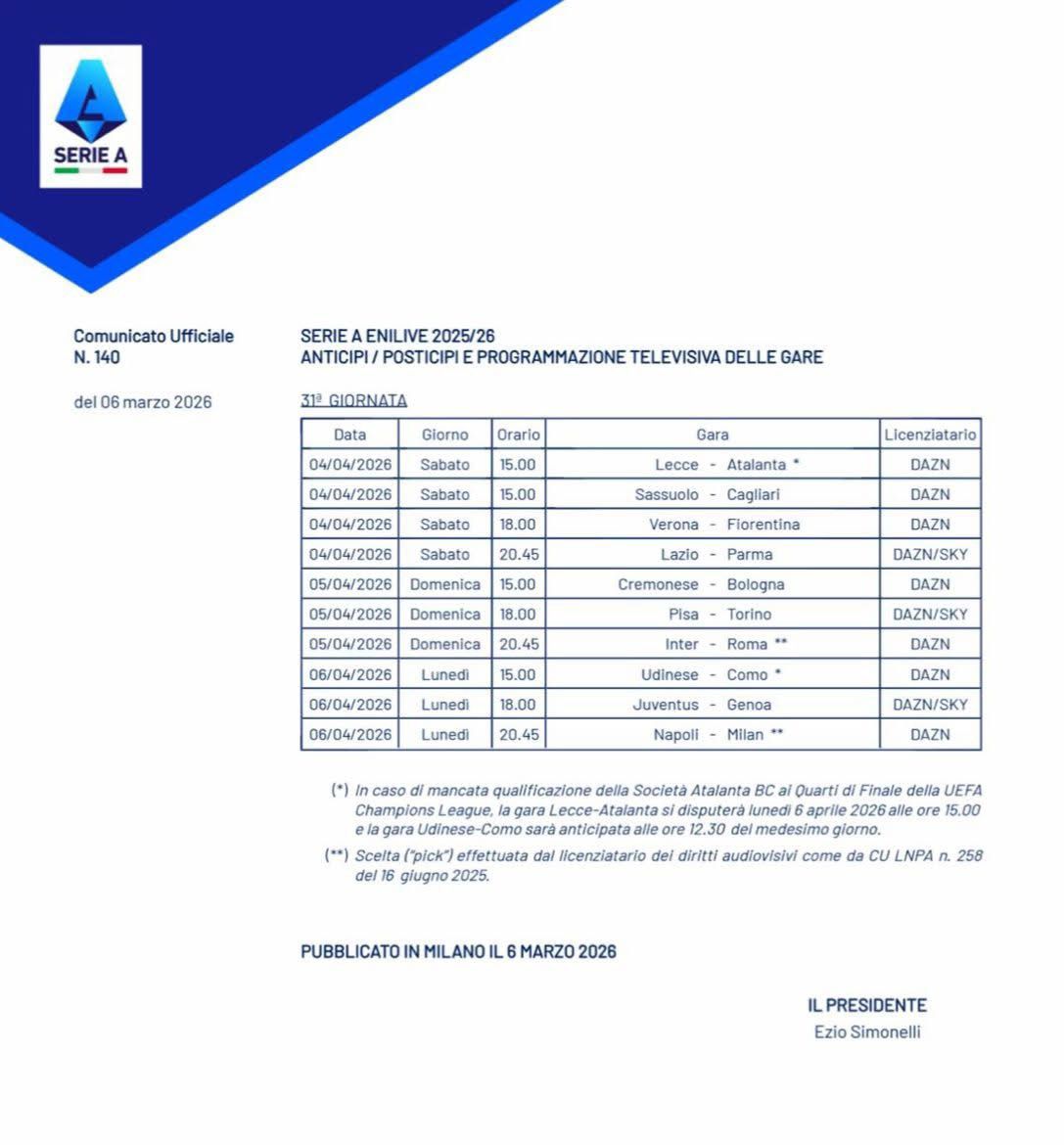 A Lecce o sabato 4 o lunedì 6 aprile. Dipende se gli ottavi di Champions League col Bayern Monaco avranno esito positivo oppure no. Dalla corsa europea dell’Atalanta dipenderà anche la programmazione di Udinese-Como, nel cosiddetto turno di Pasquetta, il trentunesimo di serie A. Ove l’eliminatoria fosse passata, infatti, i quarti sarebbero il 7 e 14 aprile.